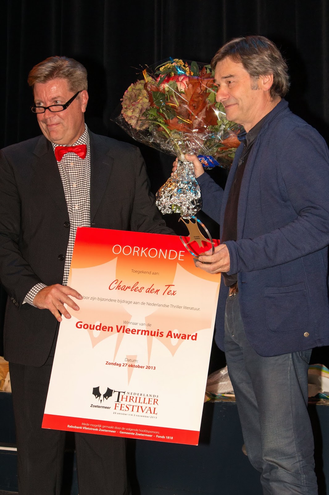 Bij de meeste uitgevers heb ik uitgebreid staan kijken en vaak ook gezellig gekletst. Bij uitgeverij de Geus kocht ik met vooruitziende blik het boek de Erfgenaam van Charles Den Tex. Later op de dag ontving hij de eerste oeuvreprijs, de Gouden Vleermuis, die door het bestuur van het Nederlands Thrillerfestival in het leven is geroepen. Volgens de jury toont Den Tex zich in zijn thriller ‘een begenadigd schrijver van internationale allure waar Nederland trots op kan zijn’.