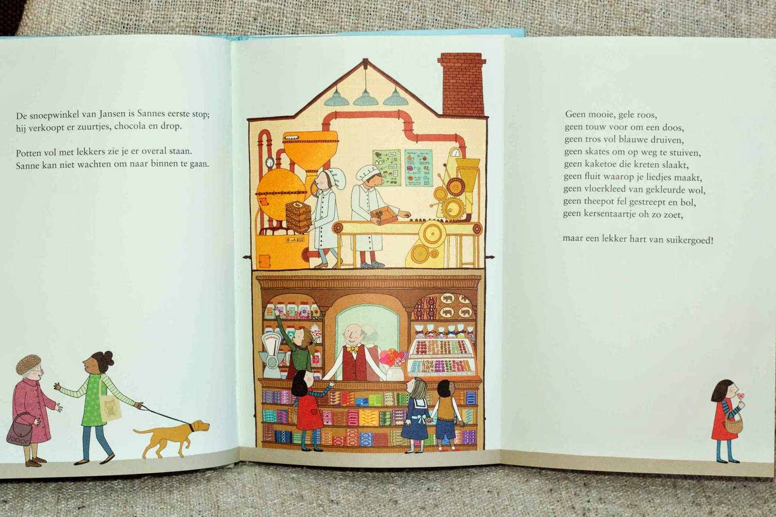Lieve, gedetailleerde en tijdloze illustraties laten de winkel tot leven komen. Naast de illustratie wordt het boodschappenlijstje van Sanne herhaald. Maar nu wordt er steeds gezegd wat ze niet koopt. tot de laatste zin waar verteld wordt wat ze wel gekocht heeft. En dat is ieder keer in een plaatje onder in de tekst te zien.