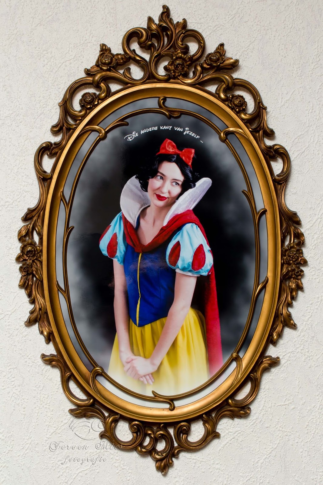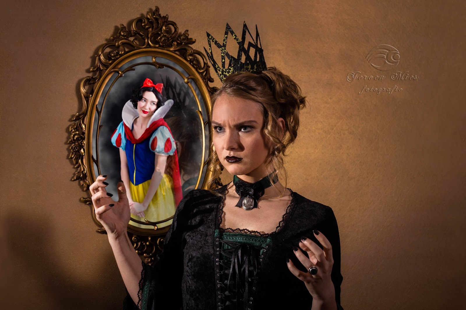 Sneeuwwitje en de boze koningin: deze foto’s zijn ook hier thuis gemaakt. Jeroen is hier behoorlijk voor aan het knutselen geweest en vond op marktplaats de perfecte spiegel voor één van zijn foto’s. Hiervoor was Sanne model voor de boze koningin, wat ze met verve deed en Lisa was Sneeuwwitje. De jurk die Sanne draagt is mijn nieuwe jurk die ik afgelopen jaar bij Archeon gekocht had. Het kroontje hebben we na lang zoeken op internet gevonden. En de make-up en het haar van Sanne zijn gedaan door Chanita die een opleiding voor visagiste volgt.