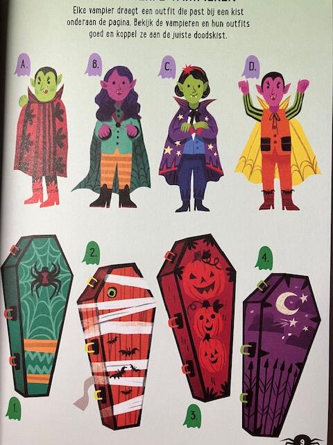De illustraties en de pagina’s zijn vol kleur en zien er uitnodigend uit. Alles is in stijl van het griezel thema zoals: de juiste schaduw vinden bij weerwolven / een spookhuis waar je goed naar moet kijken, en dan op een andere pagina vragen over moet beantwoorden/ lijnen volgen om te weten welke zombie bij welke grafsteen hoort / toverdrankjes maken met een heks / Een draken doolhof / een griezelbos waarin je een bordspel kunt doen.