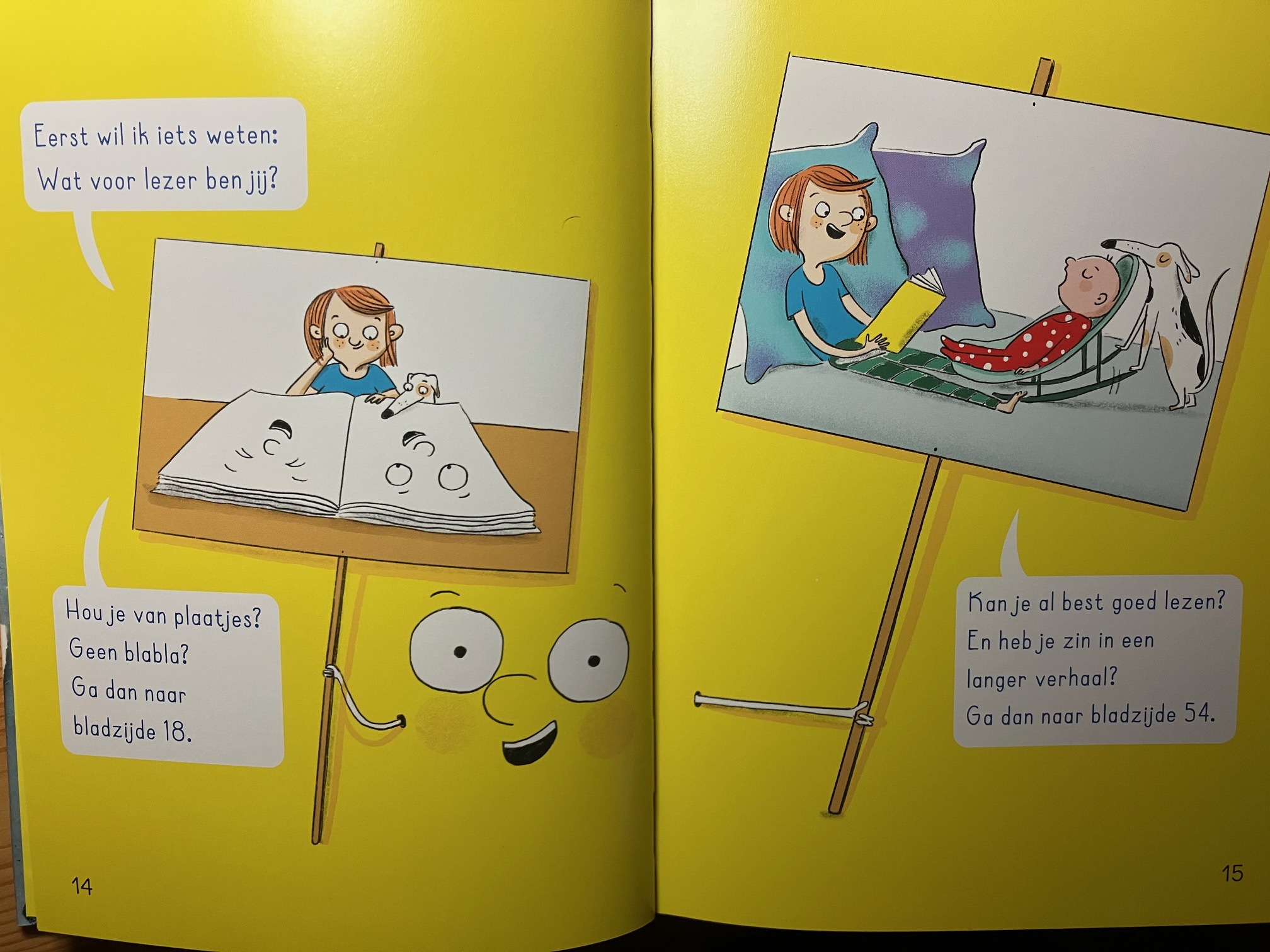 Dit is een heel speciaal boek dat praat tegen de lezer, vragen stelt en verhalen vertelt. Op de eerste pagina stelt het boek zich voor op en zegt dat het fijn is als iemand het boek leest. De pagina’s zijn in een vrolijke kleur met een aantal illustraties en kleine stukjes tekst. De achtergrond. Bij de tekst is wit zodat het makkelijk leest, ook de ruime lay-out en het duidelijke lettertype maken dat het prima geschikt is voor beginnende lezers.