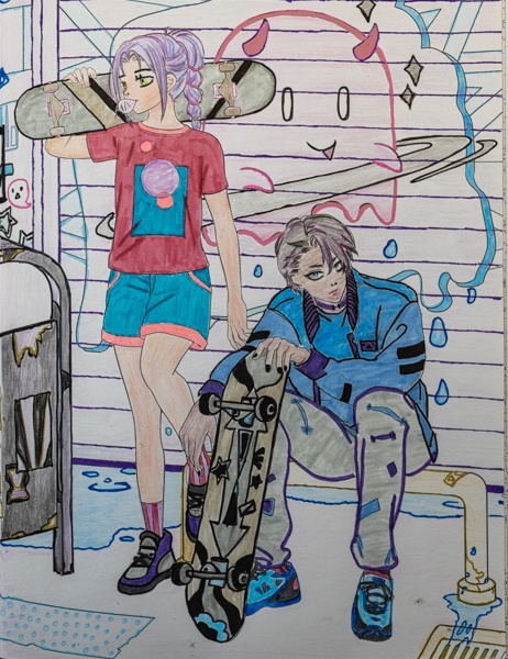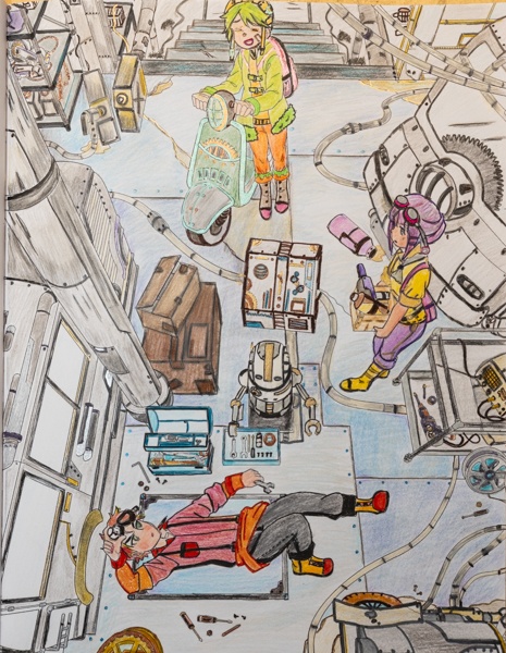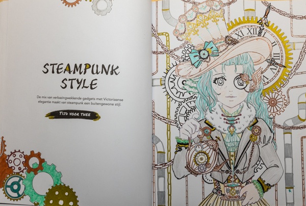 Er is ook veel verschil in hoe gedetailleerd de kleurplaten zijn en hoeveel er tegelijk gebeurd. Een aantal kleurplaten zoals de steampunk dame die ik gekleurd heb zijn rustig en overzichtelijk. Maar er zijn ook kleurplaten die heel veel beweging en / of chaos weergeven en waarin alles tegelijk en door elkaar heen lijkt te gebeuren. Precies ook wat je bij manga kunt verwachten maar best een uitdaging om te kleuren omdat het moeilijk te zien is waar de ene afbeelding begint en een andere ophoudt.