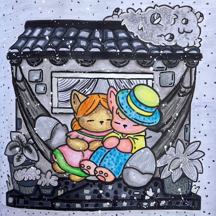 De 50 /50 challenge waarbij je de tekening in de helft verdeeld (horizontaal of verticaal) en elke helft anders inkleurt. En de Grijsschaal challenge waarbij je één element kleur geeft en de rest doet in grijstinten. Voor deze pagina heb ik van alles en nog wat gebruikt om maar zo veel mogelijk grijstinten te kunnen gebruiken.